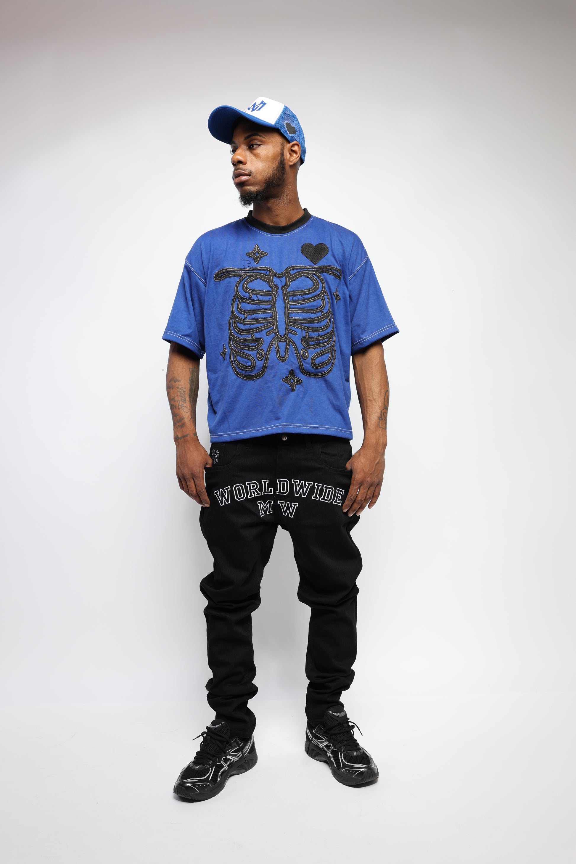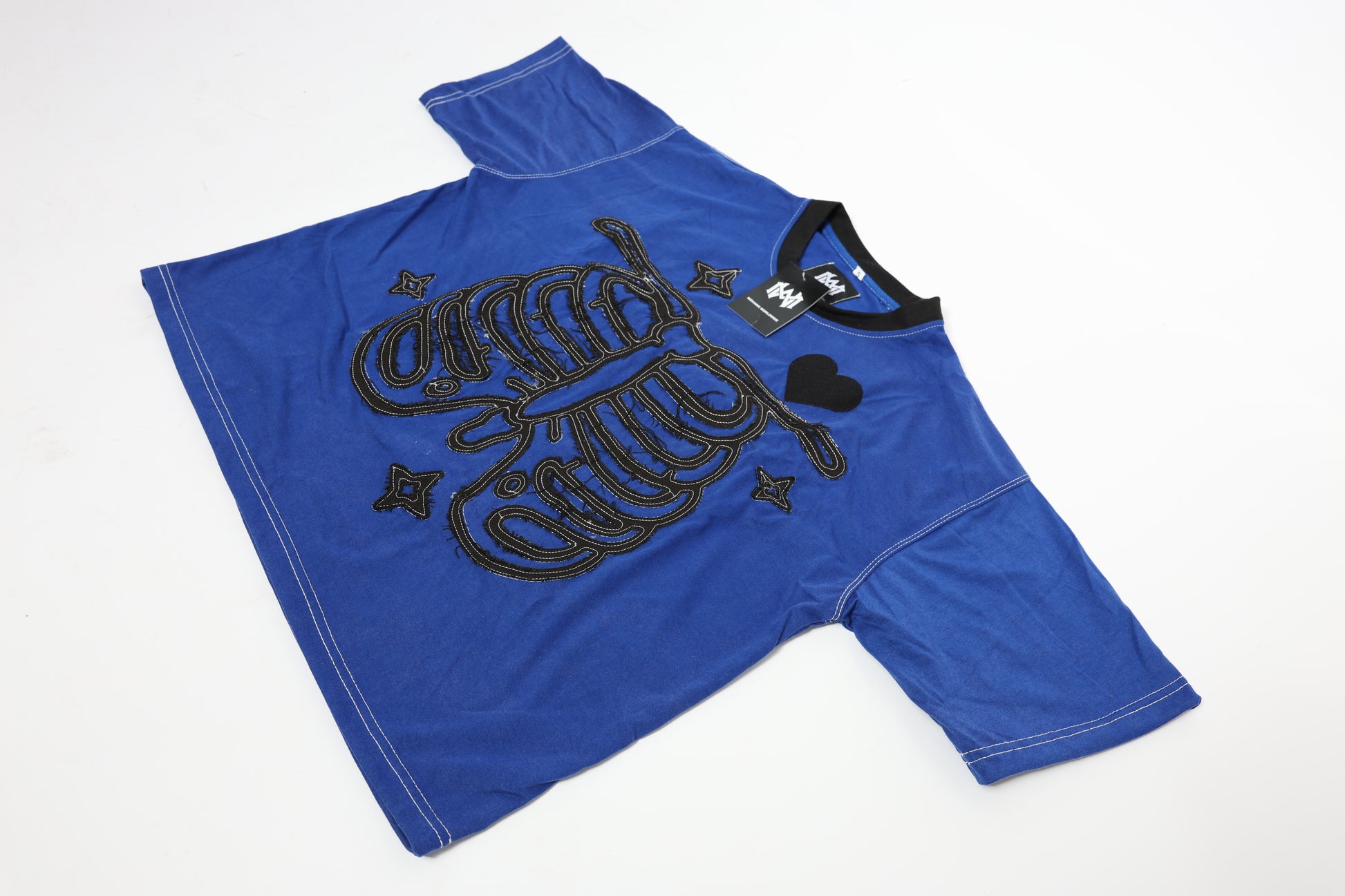 Acid washed. 100% cotton tshirt 250 GSM with distressed embroidery on front and back with a regular embroidered heart. Large-2X are not cropped.